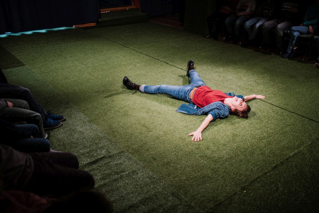 – L.I.: Nagy dilemma, mert ha bekerül az iskolába, belecsúszhat a didaktikusságba. hiszen ott a „Tanár néni, mi lett volna a helyes megoldás?”-ra szocializálódtak, Miközben látjuk, mennyire nincsen helyes megoldás. Fontos különbség a pedagógiai nevelés és a színházi nevelés között, hogy itt sokkal nagyobb a szabadság. Mi arra adunk lehetőséget, hogy a gyerekek maguk kísérletezzenek kvázi laboratóriumi körülmények között különböző emberi és társadalmi problémákkal. Attól, hogy nem minden záródik le bennük, hanem tovább kell még kicsit őrlődniük magukban a problémákon, semmi bajuk nem lesz.