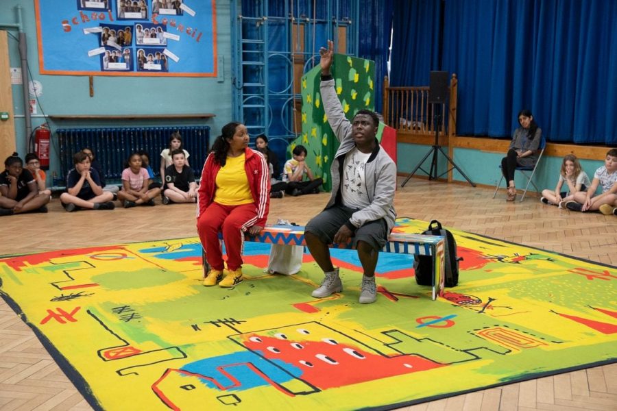 Bár figyelem a Unicorn műsorát, mert a londoni színház az egyik legfontosabb gyerek- és ifjúsági színházi befogadó és produkciós helyszín, a felvételbe a The Guardian oldalán botlottam bele. Bizony, a nagy olvasottságú lap az elmúlt pandémiás másfél évben több alkalommal is gyerekszínházi projektek mellé állt, és valószínű, hogy annak a megjelenésnek köszönhető a június 15. óta elért 45 ezer fölötti megtekintés. Azt nem tudom, ebből mennyit váltanak át igazi, iskolai előadásra, de szerencsések azok a kisiskolások, akik elé kigurítják a YouTube-on látott díszlethez képest csak egy picit redukált, egy autóba simán beférő, igazán színes és fantáziát beindító szőnyeget.