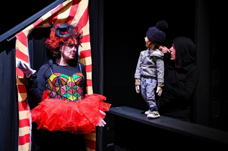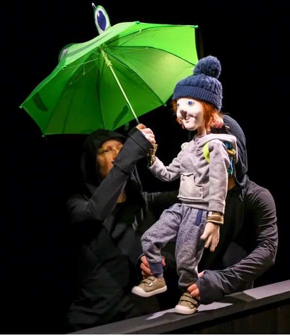 Az eszképista képzeletet és a kötelező feladatokkal teli valóságot egymásnak feszítő tanmese tanulsága az, hogy a gyerekek világgal szembeni határtalan naivitása és felnőttekbe vetett végtelen bizalma a fantáziával együtt veszélyes kombinációt alkot. Ezzel az alapvetéssel nem véletlen, hogy az előadás tere könnyen mozgatható sötétszürke és majdnemfekete pultokból és paravánokból áll, utóbbiak pedig a bunrakuszerű, két bábos mozgatta főszereplő báb méreteihez képest úgy aránylanak, mint a nagyvárosokban egy felnőtt egy minimum tízemeletes házhoz. Nyomasztó világ, néhány szín, rakoncátlan rőt haj, zöld esernyő, a cirkuszi piros-fehér élénkíti csupán. (Látvány: Bandura Emese, fény: Szátvári Csaba)