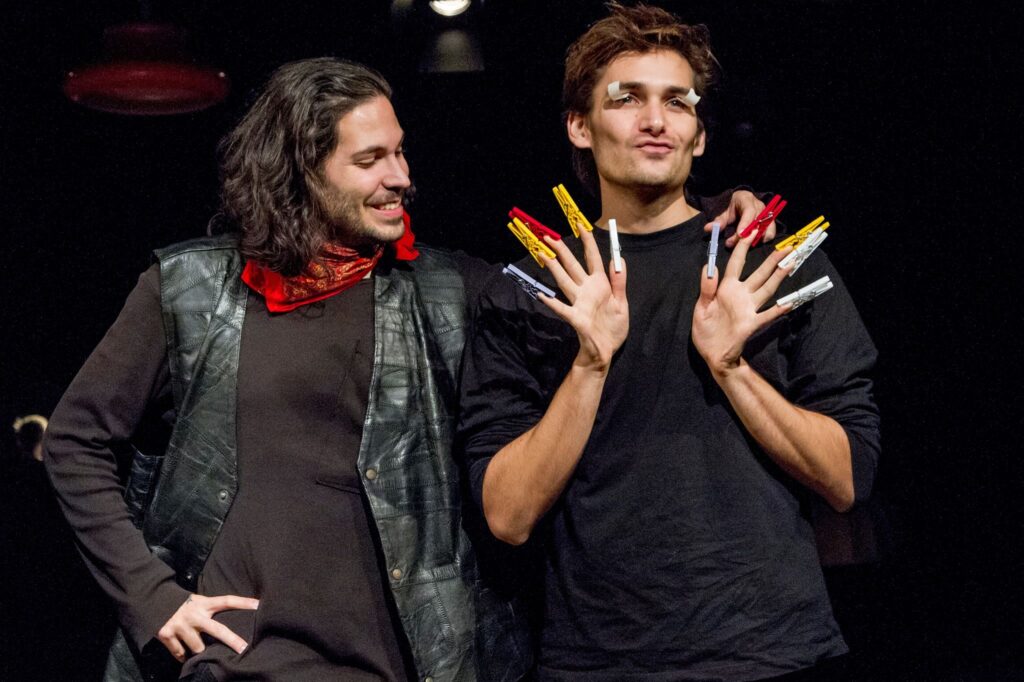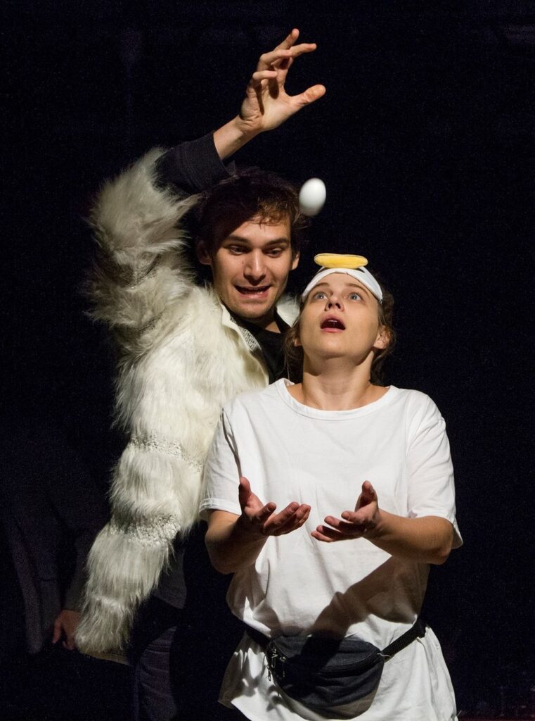 Az előadás legfőbb humorforrása, hogy állatok szájába ad filozófiai mélységeket érintő gondolatokat – ráadásul olyanokéba, akik köztudottan nem a legokosabb fajok, mint például a tyúk vagy a galamb. Sokszor nehéz beazonosítani az egyes állatfajokat, habár Martinkovics Máté, Szalay Bence és Hrisztov Toma mindent megtesznek annak érdekében, hogy a metamorfózis érthető legyen. Ők az előadás átváltozóművészei. Állatos hasonlattal élve: kaméleonjai. Egymás után vetik le, majd húzzák fel a különböző állatfajok „bőrét”, ami nem kis feladat. Az állatok utánzása, fő jellemzőinek kidomborítása és kifigurázása könnyen vezethet oda, hogy a színészek átesnek a paródia küszöbén, de szerencsére itt nem ez történik. Az átalakulások meggyőzőek, követhetőek, és egyáltalán nem parodisztikusabbak annál, mint amilyennek lenniük kell a darab stílusából adódóan.