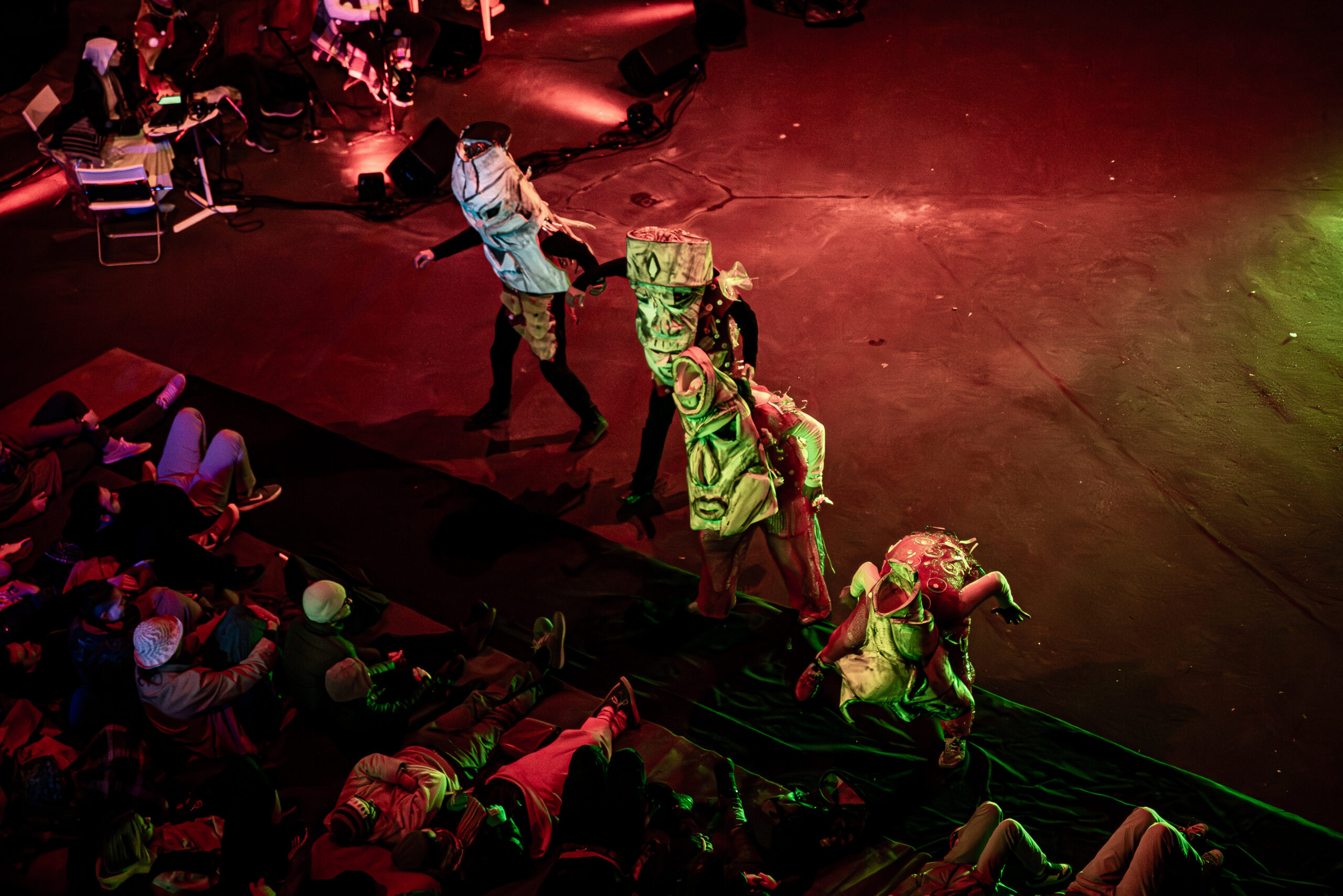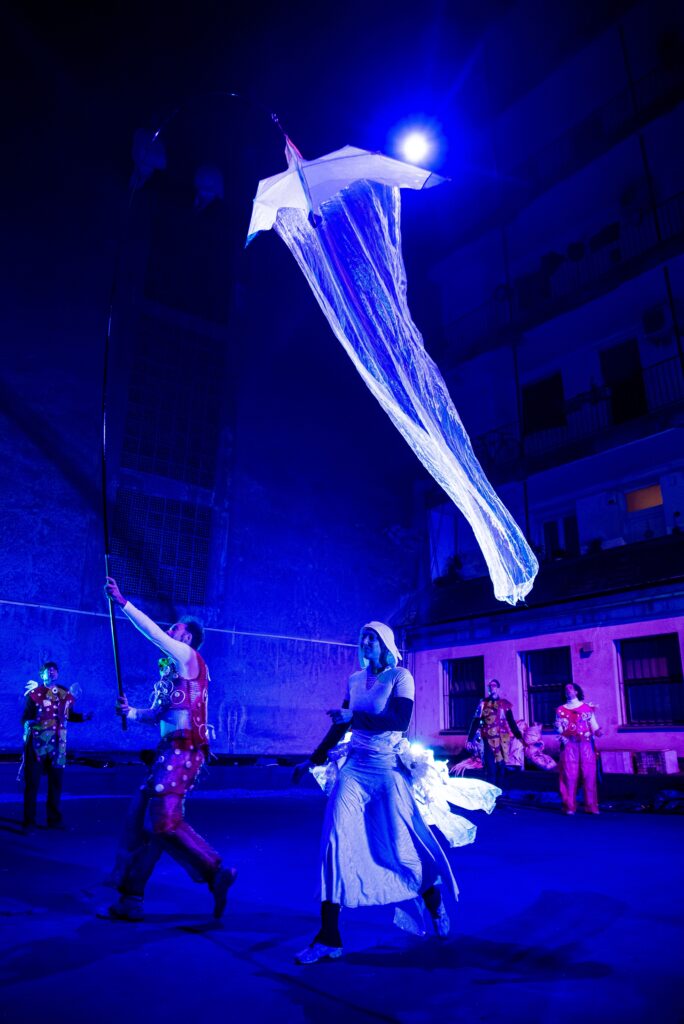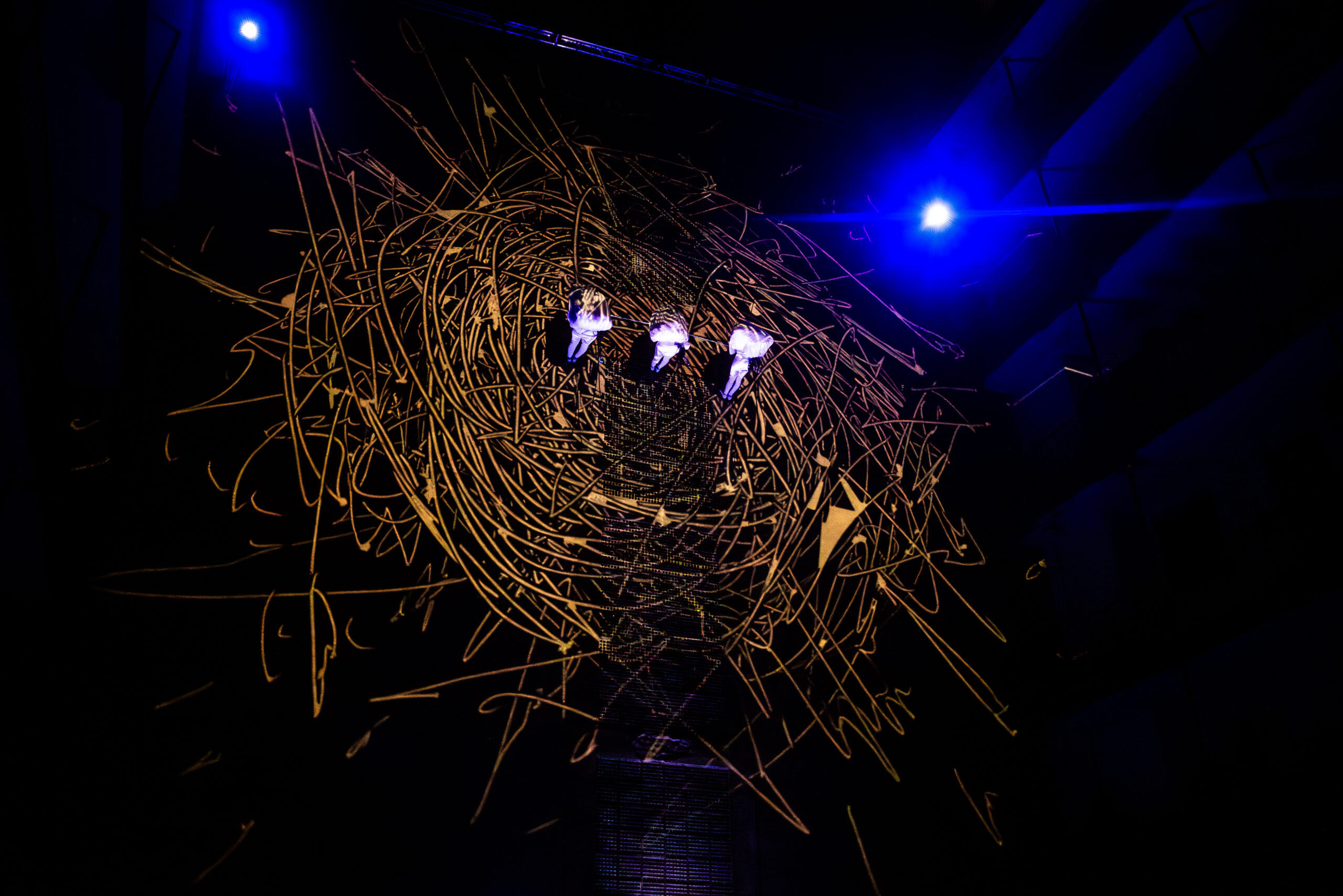A történet az udvaron kezdődik, clownszerű alakok kergetőznek és huzakodnak közöttünk, velünk. A földi dimenzió harsánysága és elrajzoltsága a vásári (vagy éppen fesztivál-)hangulatot célozza, ebben a konszolidált környezetben inkább kevesebb, mint több sikerrel. Az égi események nyitóképe megindítóan szép és érzékletes: a fénnyel falra festett, stilizált fészekből éppen kikelnek a fiókák, majd kismadárként mocorogva, ugrálva és röpködve fedezik fel és lakják be a magasságot. A lentiek legjobb esetben is csak félreértik és kifeszített hálóval óvják a madarakat a lezuhanástól, amúgy pedig egymásra tornyosított emeletesházakkal próbálnak (hasztalan) elérni hozzájuk, egy ponton pedig félelmetes földi lények lerángatják, meggyötrik és véglegesen elszakítják egyiküket a levegőégtől. A szeretet azonban sok mindenre képes, és végül mindannyian a fészkünkre találhatunk – szól a magasságban játszódó zárójelenet légszínház nyelvén megfogalmazott, zenés-énekes üzenete.