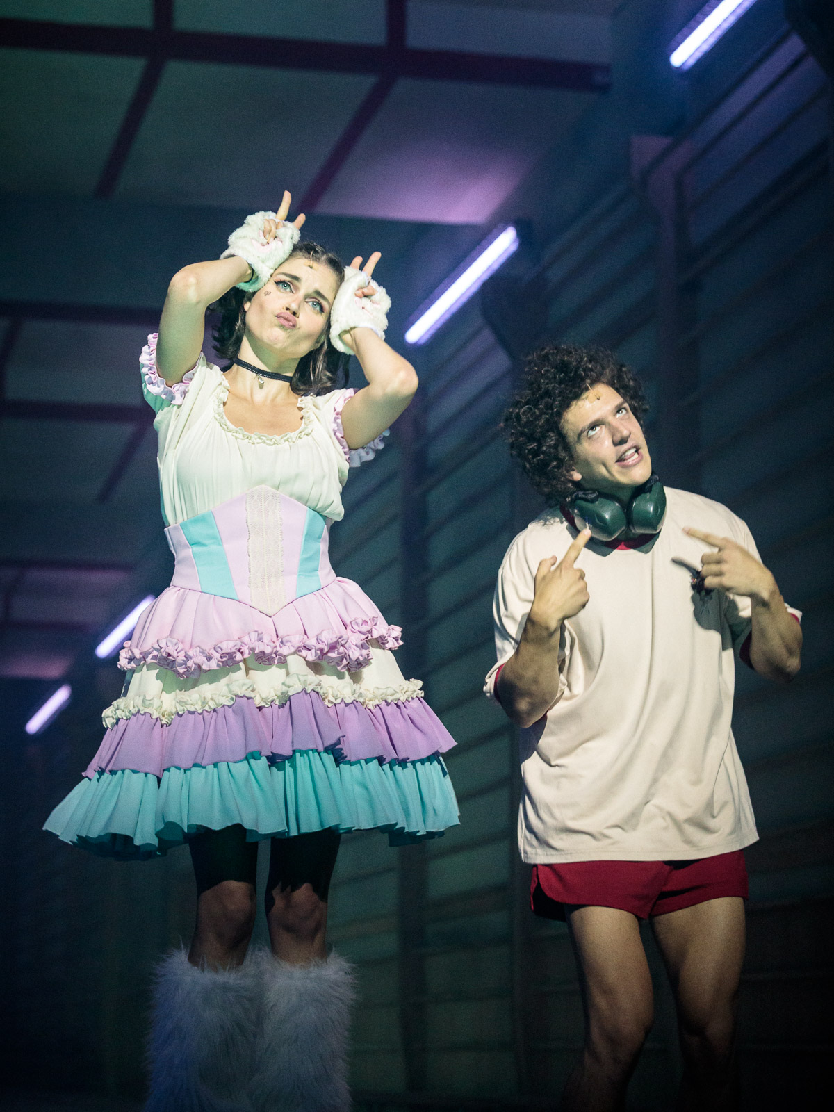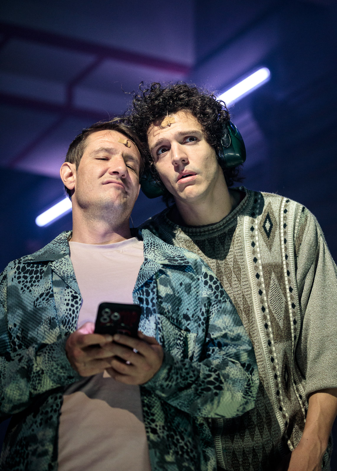 Az előadás már az előcsarnokban elkezdődik, Fellner és Helmer aranycirádái közt, szobrok és színháztörténet közé beszorítva melegítőben futnak helyben a fiatalok, fülhallgatóval kizárva a világ ingereit. Eleve kipukkanthatatlan a buborék, vagy ők erősítik tudatosan, belülről a hártyát átjárhatatlanra? A nézőtéren lüktet a zene, a reflektorok fényei vibrálnak, ide-oda cikáznak, a szünetben szelfizni lehet a színészekkel, a végén meg bulizni, az élményszerűség az első pillanattól az utolsóig kitett.