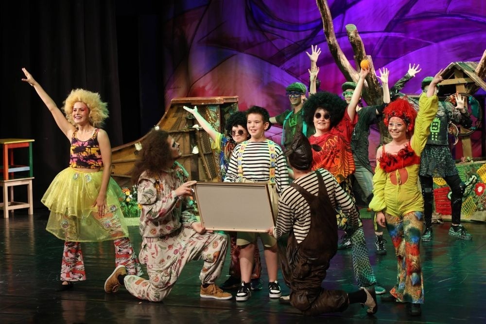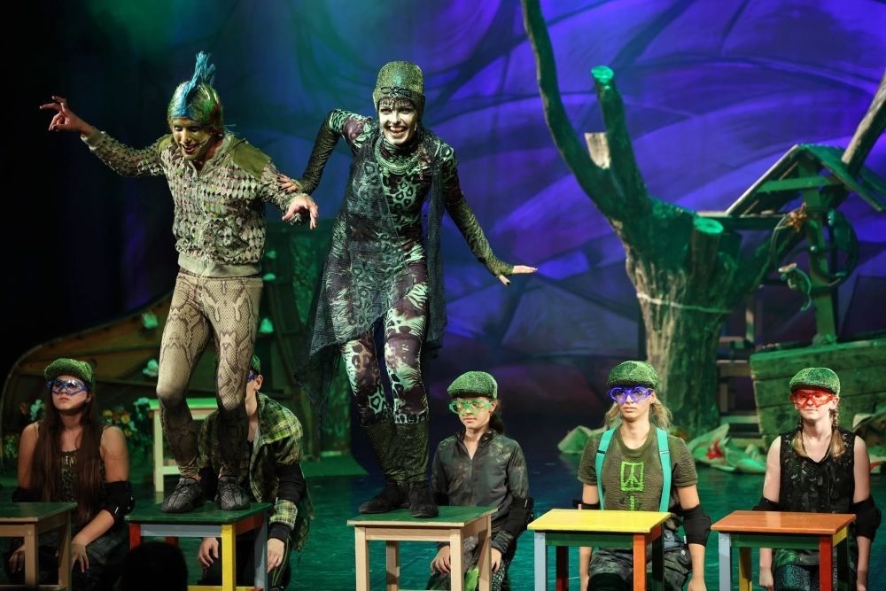Az előadásnak valahol éppen ez a sokszínű, zajos őskáosz az erőssége. A rengeteg szereplő és a nagyszámú gyerekszínész révén Hrutka Róbert zenéje és Widder Kristóf koreográfiája ismétlődő dalokkal kísért, relatíve grandiózus, mégis precízen koreografált tömegjelenetekben kapcsolódik össze. A némi dekoráció és háttér mellett főleg színes székekből álló díszlettel a színpadképek legtöbbször inkább szedett-vedett benyomást keltenek, Rátkai Erzsébet frappáns jelmezei sokkal meghatározóbban gazdagítják a látványt, és különösen jól hangsúlyozzák az állatfajokat a jelmezekhez tartozó frizurák, fejdíszek, kiegészítők.