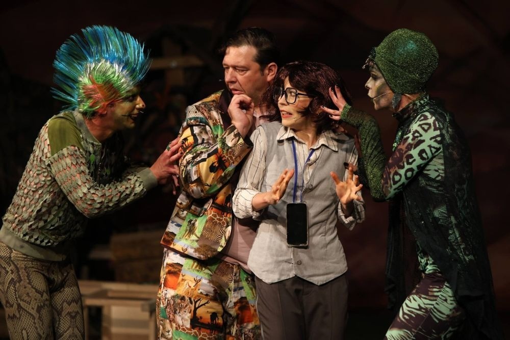 A felnőtt színészek közül az orrszarvú, Pablo szerepében Koscsisák András kicsit Micimackó Fülesére emlékeztető, melankolikus-komótos beszédmodorával a megbízhatóbb alakítások közé tartozik. A nehezen komolyan vehető gonosztevők szerepében Kárpáti Barbara mint szalamandra-királynő és a szervilis leguánt játszó Szelle Dávid szórakoztatóan alkalmazzák a hüllőtestbeszéd, hüllőmozgás, fintorok, nyelvöltögetések humorát és a főgonosz-sidekick paneleket. Kevésbé kiemelkedő az anyaként sokszor sziruposan csengő Gyenis Erika, de nincs is könnyű dolga, például a rajzpályázat megnyerése után egy annyira patetikus dalt kap anyai szenvedései gyümölcséről, hogy azt nehezen lehetne autentikusan megszólaltatni. Különösen kellemetlenek a karikatúraszerű üzletembert játszó Keresztesi Lászlóval közös jeleneteik, harcias duettjük. Természetesebben hat az üzletember irodista rabszolgáját játszó Kátai Kamilla, ott az tűnik fonáknak, hogy az elnyomás alól való felszabadulásával egyidejűleg drasztikus külső átalakuláson is keresztül kell mennie a konvencionális női szépség irányában.