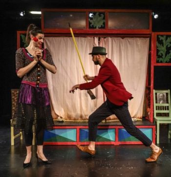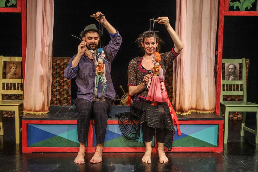 Magát a bábszínházat, amelyet Boráros Szilárd tervezett egyszerűre és patinásra, marionettbábokkal népesítették be a színészek. Noha csak négy kezük van, nem mertem volna megszámolni játék közben, mert biztosan nagyobb eredményre jutottam volna.