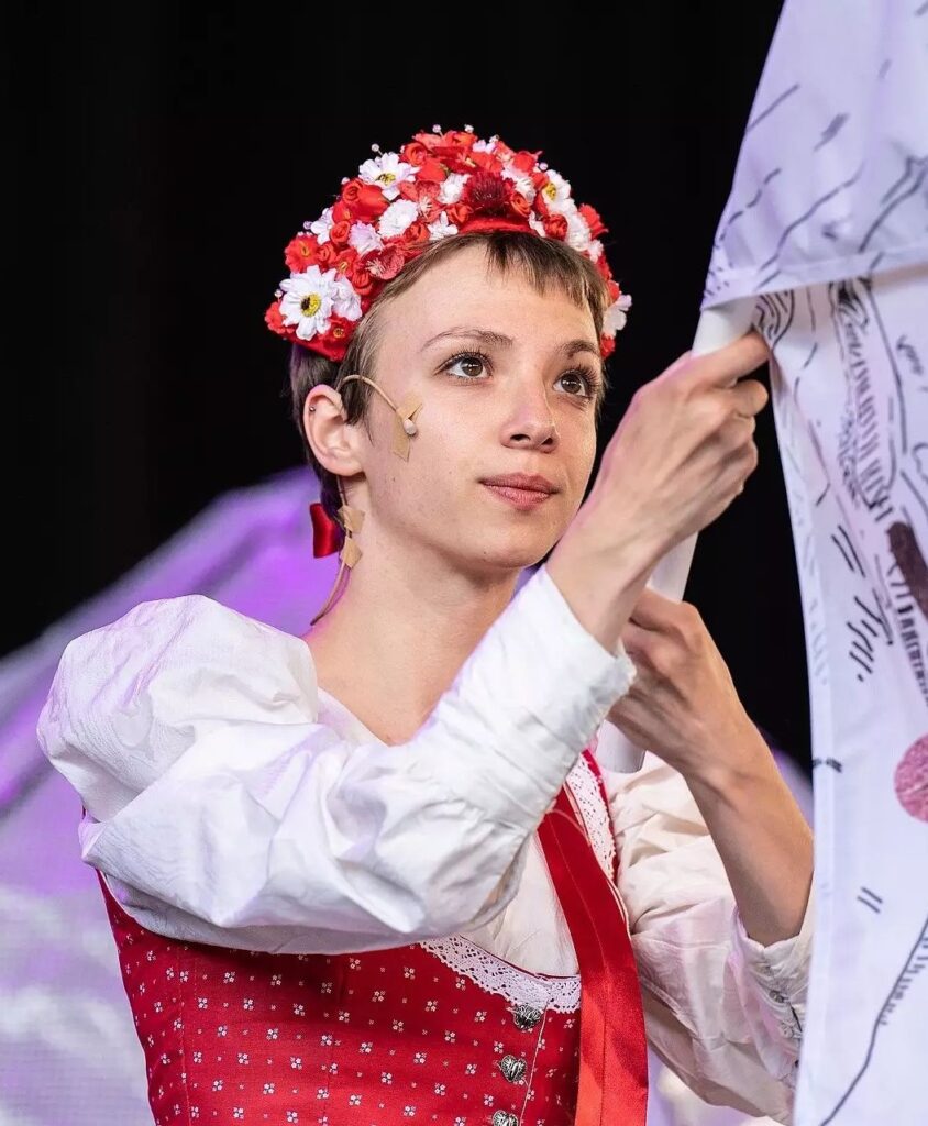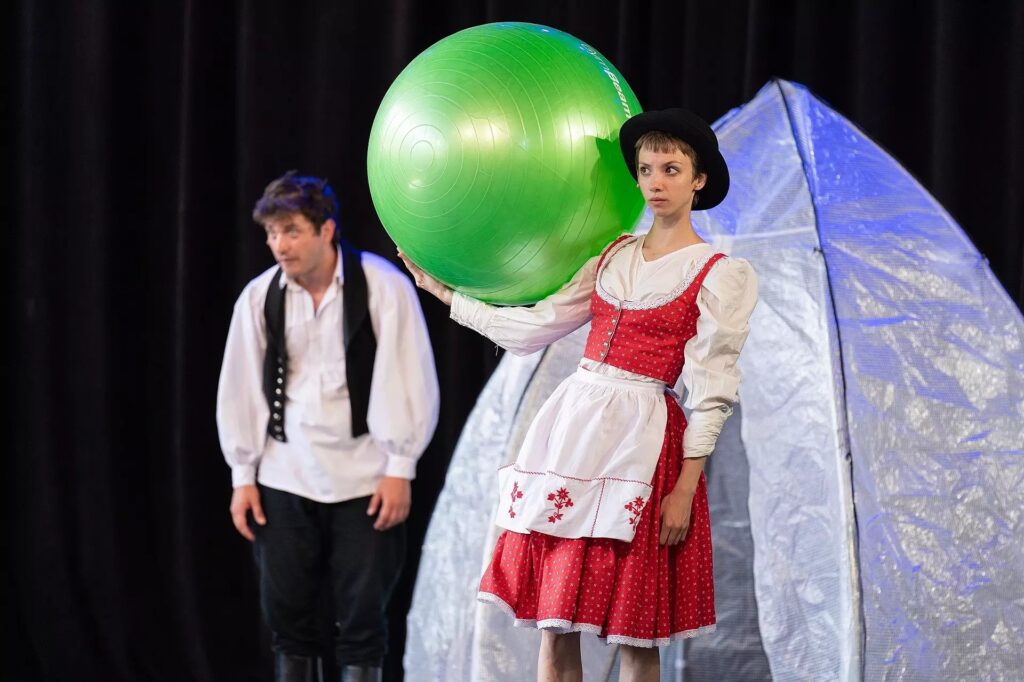 A fő díszletelem egy kevéssé kihasznált, műanyag zsákvászonból készített, cipzárral csukódó szürkésfehér sátor. Előtte műanyag „zsombékok”, amikről később kiderül, hogy egyensúlyozó avagy koordinációs félgömbök, gyógytornára is alkalmas, edzőtermi segédeszközök. Közöttük fekszik egy óriás telefonnak tűnő valami, de az még okoz majd némi meglepetést. A sátorból előbújnak a szereplők, a szép hangú, paraszti ünneplőbe öltözött fiú kicsikét citerázik, a lányka pedig pirosdíszes, általánosságban vett népies-magyaros díszruhában penderül elénk. Tündérországról kezdenek beszélni, oly módon törve a verssorokat, hogy nyegle prózának tessék a megszólalásuk. A leány később énekelni kezd, furcsa, éteri dalocskát, aminek hallatán arra gondolok: Oh, ez alighanem afféle gyerekoperácska lesz. De nem, ez a fajta muzsika később alig fordul elő. Viszont időnként hatalmas selyemzászlót lobogtatnak, amin kivehető egy lovát ugrató huszár alakja, ha ez nincs, bejön egy hatalmas, zöldezüst színű, fényes gumilabda. Csak úgy.