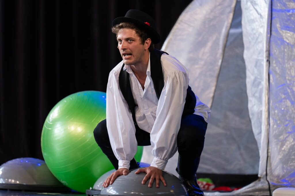 Közben azt észlelem ijedten, hogy citerával, félig eltáncolt pontozóval, csapásolásokkal és edzőtermi ügyességi játékokkal miként próbálják elnyerni a gyerekközönség figyelmét és rokonszenvét, s hogyan hatódnak meg saját maguk is az óriási, fröccsöntött pink pisztolyból előtörő szappanbuborékoktól. A telefonnak nézett tárgyat kibontják, futópad lesz belőle. Futnak és pattogatott kukoricát eszegetnek. A töméntelen izgága ötlet egymást hatástalanítja.